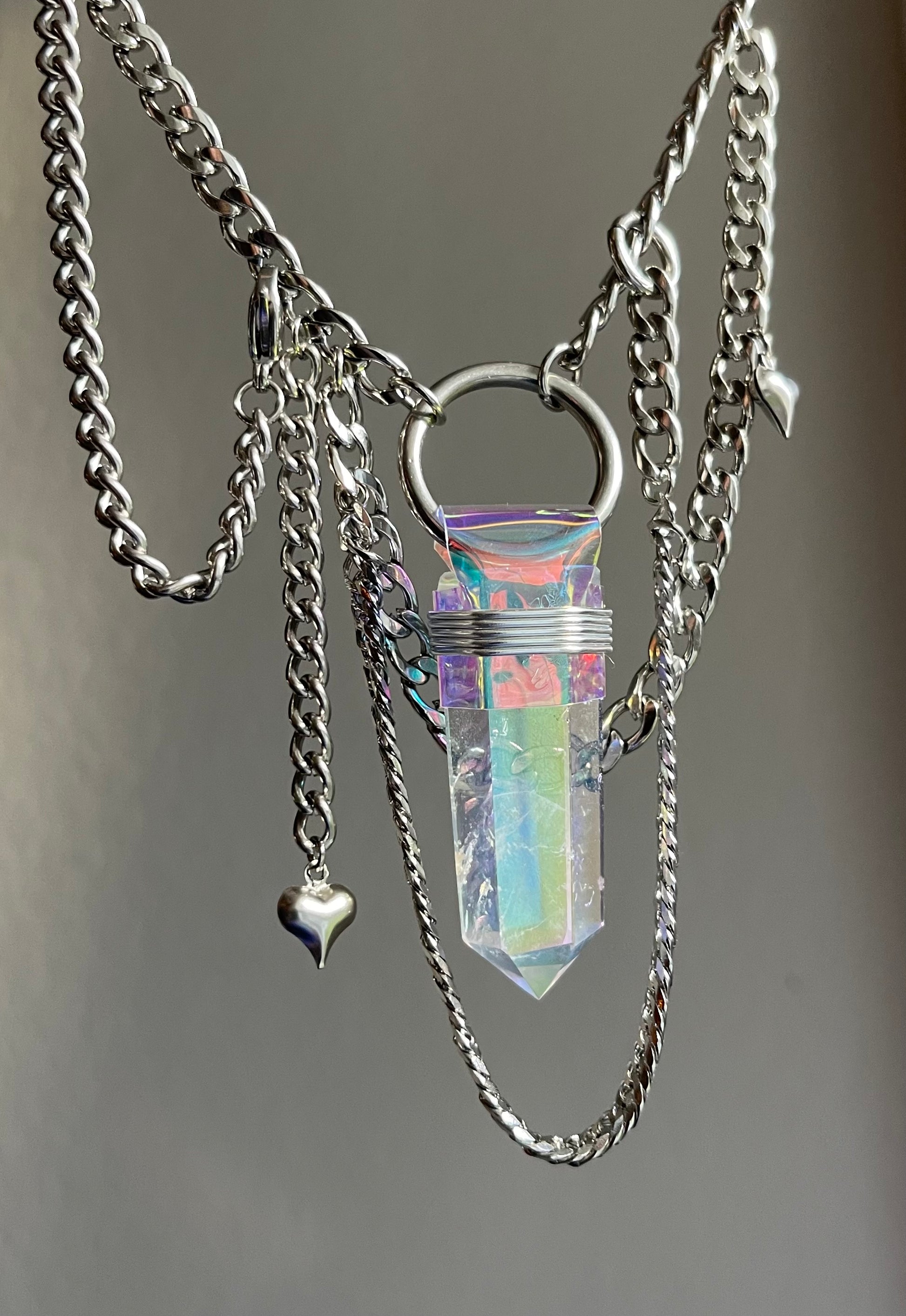 Angel aura quartz in holographic wrap with all stainless steel chains and charms. Measures 18 inches